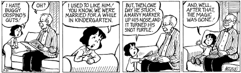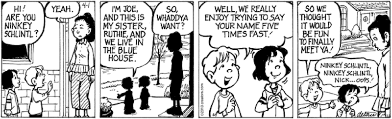 Two psychological phenomena of ordinary life in One Big Happy strips from 2010 (replays of which have come by in my comics feed in the last few days) — the Purple Snot strip (from 3/31/10) and the Ninkey Schlintl strip (from 4/1/10):