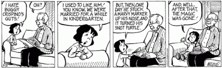 Disillusioned affection. A common enough phenomenon in everyday life (but lacking a conventional term referring to it; given #1, you might refer to it as the Purple Snot Phenomenon, or PSP). In one form of PSP, love for someone is dampened by learning of their deficiencies — their inclination to anything from mere gross behavior (producing metaphorical purple snot) through actual viciousness. “Then I learned what they were really like…”