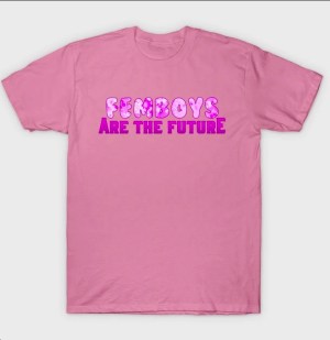 There are young men who present themselves with various of the trappings and behavioral inventories of women (while identifying themselves as boys), sometimes using the label femboy or sissyboy. The FEMBOYS ARE THE FUTURE -shirt (available from TeePublic in a number of colors, but of course soft pink is the way to go):