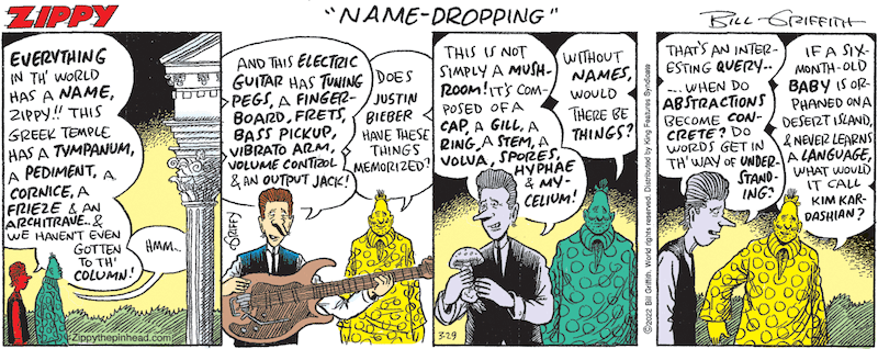 Name-dropping. A Greek temple, an electric guitar, and a mushroom walk into a comic strip, where — oh, Cratylus! — they encounter a colloquium on linguistics and philosophy.