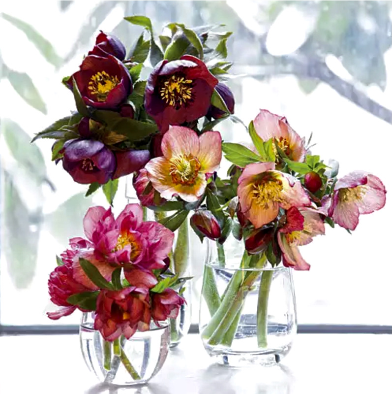 Hellbores come in white, dusky purple, and green. An assortment of Helleborus x hybridus flowers (in the rose to dark purple range), in vases: