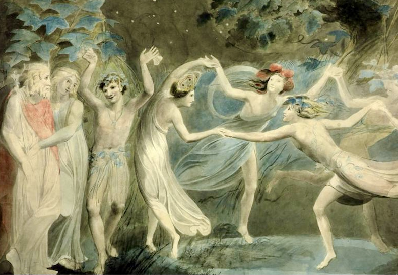 (#2) Oberon, Titania and Puck with Fairies Dancing, by William Blake, ca. 1786 (Tate Britain Image) [with Puck looking both fey and a bit diabolical]