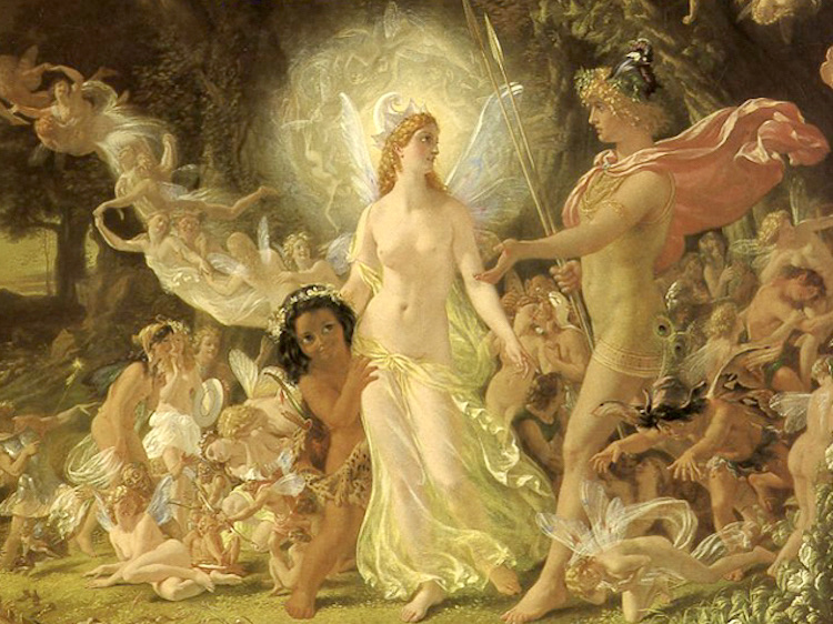 (#1) Study for The Quarrel of Oberon and Titania by Sir Joseph Noel Paton: the king and queen of the fairies, plus Puck