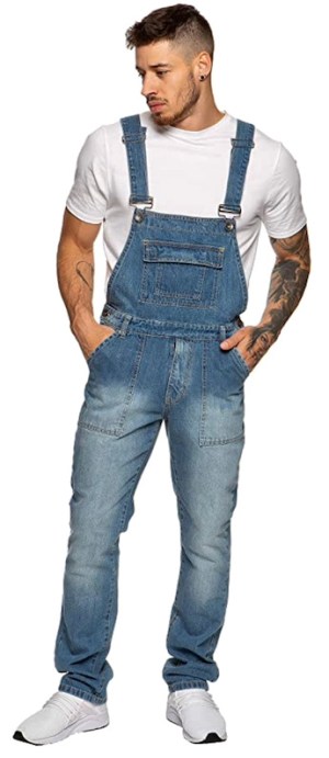 Jumpsuits have followed a path similar to overalls. Which means that in plain serviceable fabrics and colors, both overalls and jumpsuits retain the masculine cachet of manual labor, dirty work of all kinds. As in these Enzo Jeans denim overalls from Amazon: