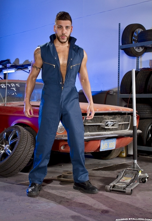 And then Mike De Marko as a Raging Stallion fashion mechanic in a jumpsuit (preparing for a bout of receptive sex with a co-worker):