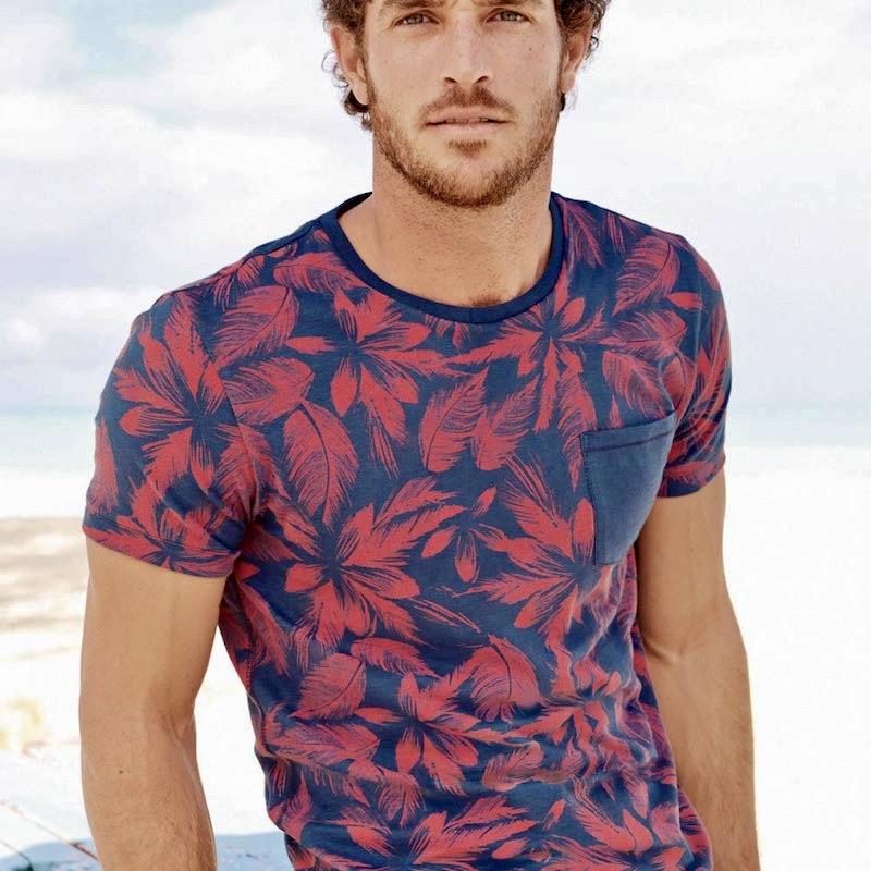 Now I collect images of such things, rather than the things themselves, and I tend to specialize in floral patterns (well, I’m a plant person as well as a queer person). From the GentleManual site, “Floral Style: A Masculine Guide to Fresh Floral Prints” from 8/1/19, this attractively flamboyant floral t-shirt, worn by a model who’s also to my taste (though not flamboyantly posed):