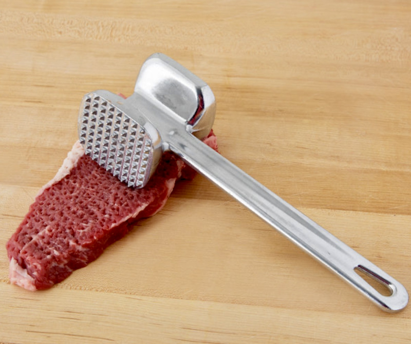 (#5) 10ʺ aluminum meat tenderizer from the Webstaurant Store, with meat