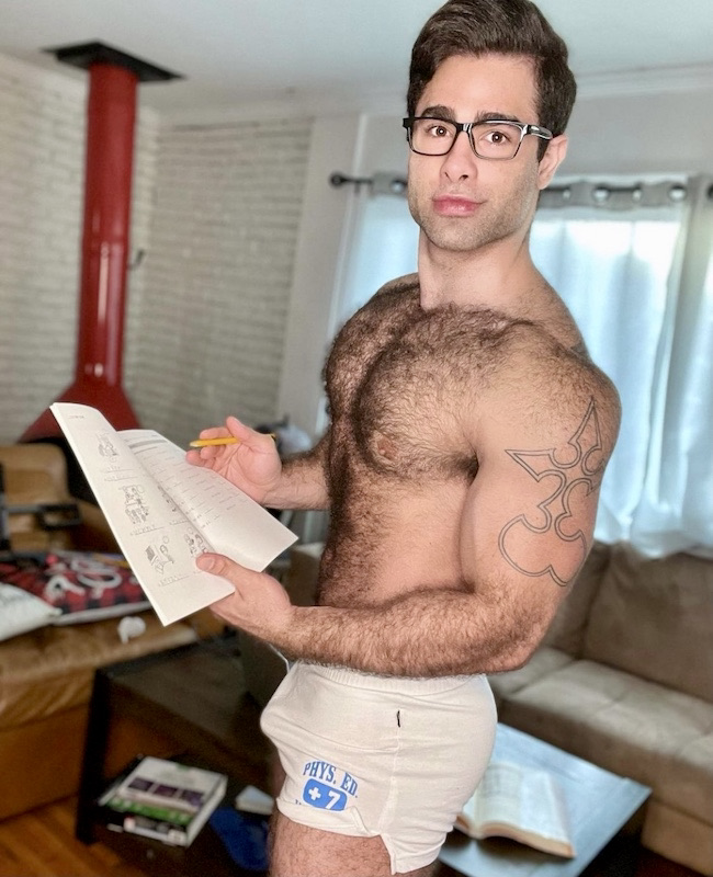 Compare this to the much more composed — but note the jutting moose-knuckle — somewhat earlier hairy-muscletwink photo from the GLUE interview, presumably taken in the actor’s West Hollywood apartment: