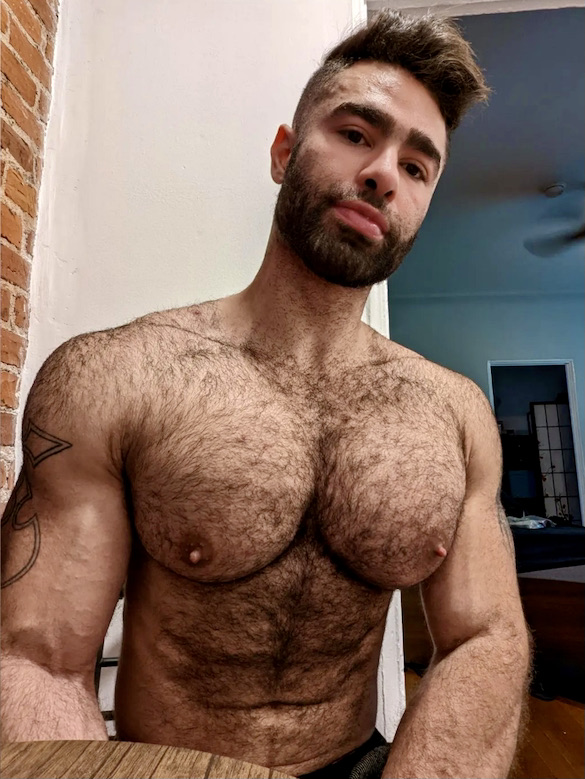 (#8) Fully hairy body, bearded rather than scruffy, his characteristic mane of hair now wild rather than styled, huge muscular pecs (lots of gym hours there), plus those tits; still an uberbottom, but now in a seriously butch body — and presenting himself with a rougher manner, challenging men to work his tit hards and fuck the cum out of him