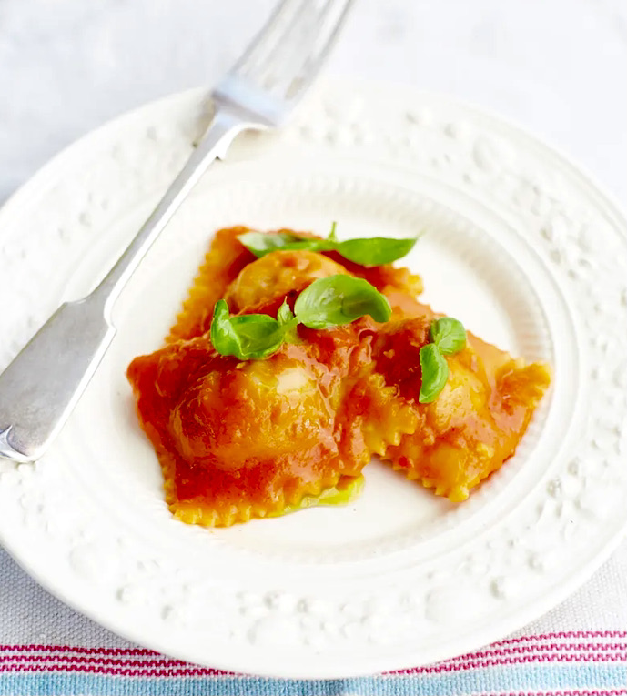 As a mass noun: pasta in the form of square, circular, or semicircular envelopes with a filling of cheese, vegetables, or meat, usually served with a sauce. Also occasionally with plural agreement.