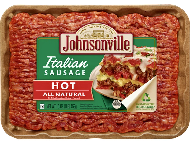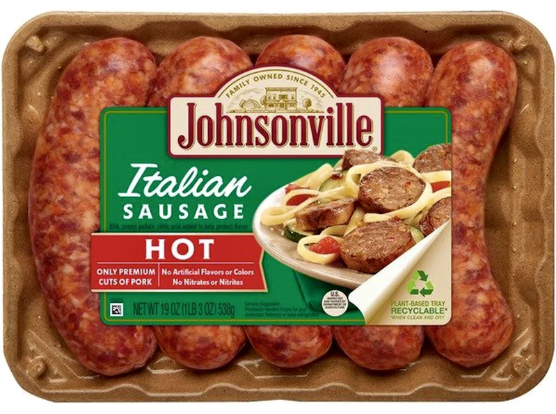 The first complexity here is that for many speakers, sausage in both of these senses seems to be doubly classified for C/M, so that these speakers are comfortable both with Get some sausages for dinner (PL C) and Get some sausage for dinner (SG M), referring in both cases to the purchase of food items in encased links. Contrast this treatment with that of frankfurter and hot dog (among other nouns), which are resolutely C only. And — surprise! — with yet another sense of sausage ‘sausage meat’ (another beheading), which is resolutely M only (since it refers to ground meat, which is stuff rather than things). Here, two ads for Johnsonville (hot) Italian sausage, the first with sausage in NOAD‘s sense a ‘(raw) link sausage’, the second with beheaded sausage ‘sausage meat”: