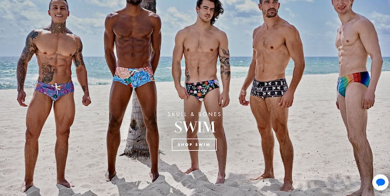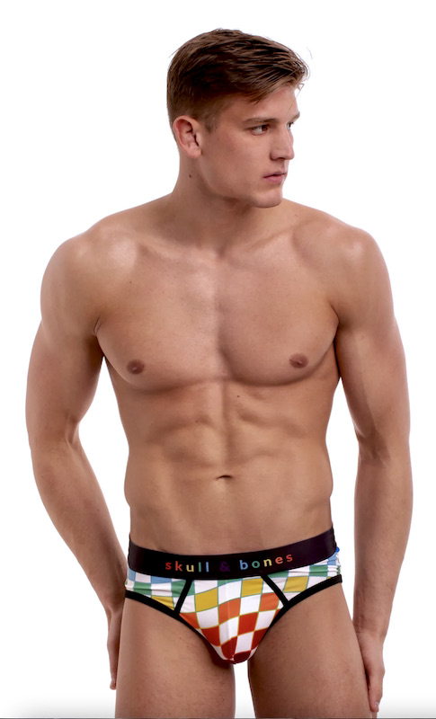 The day started with some Elia beachwear in gayboy-themed patterns, in my posting “Hey, buddy, we’ve been waiting for you!” While I was posting that, among the swarm of swimwear and underwear ads that infest my Facebook page came a deeply goofy ad for Skull and Bones underwear (and related apparel), set in a subway car: