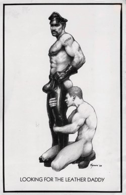 The Leather Daddy. Two views from many. First, from my 9/19/17 posting “Disney meets Tom of Finland” (about depictions of Disney’s Seven Dwarfs as muscle daddies), Tom of Finland leather daddies on the cover of a ToF documentary: