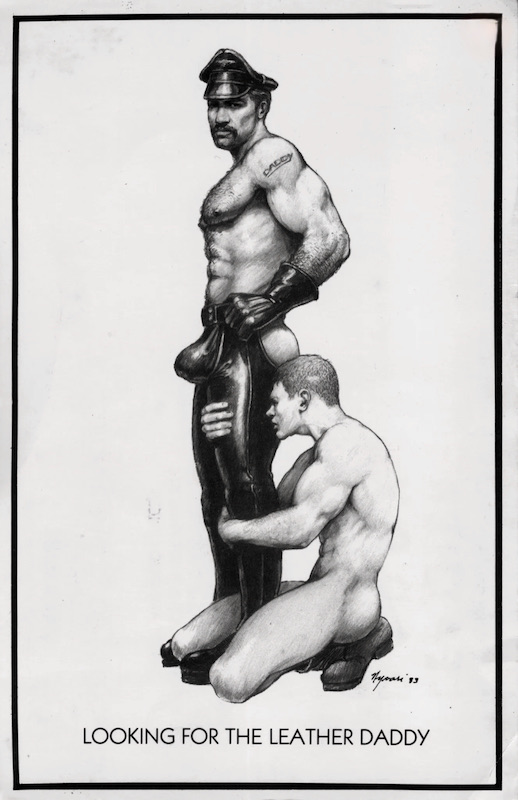 (#4) [seller’s description:] Oversized postcard Leather Daddy Contest Postcard at CHAPS at 375 Eleventh St [San Francisco], (the current DNA Lounge) one of SOMA’s [the South of Market district’s] infamous leather bars, opened in the Fall of August 1983. Looking For the Leather Daddy illustration by Robert Uyvari.
