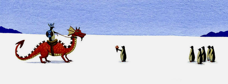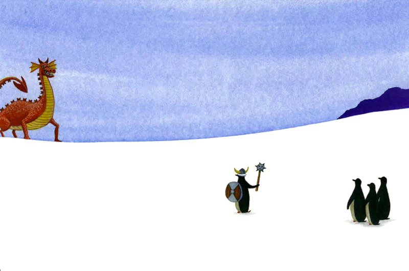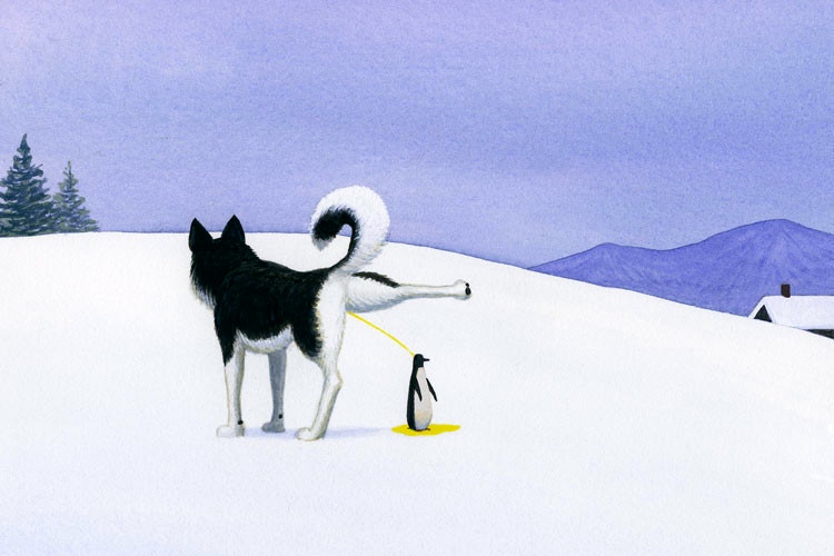 (#1) On a snowy slope, four determined rabbits (their ears streaming back in the breeze) in a canoe are gaining on two penguins on skis (one of them looking back, no doubt in anxiety, at their pursuers)