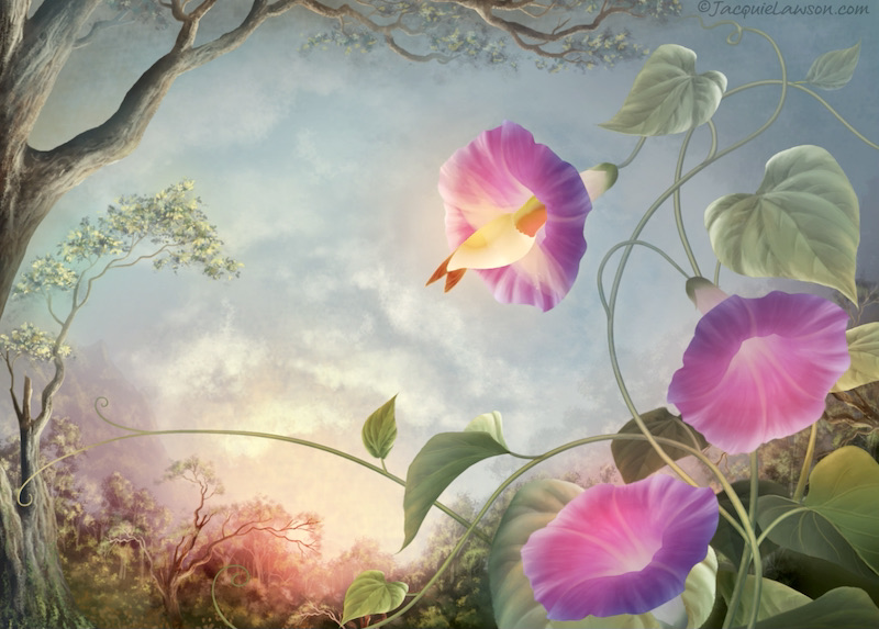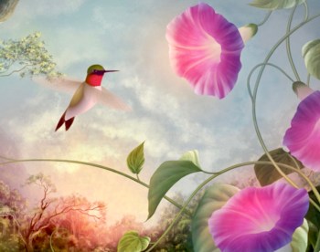 Ah, the red-throated hummingbird has plunged all the way into the quiveringly open pink bell of of the welcoming morning glory: the morning hummer.
