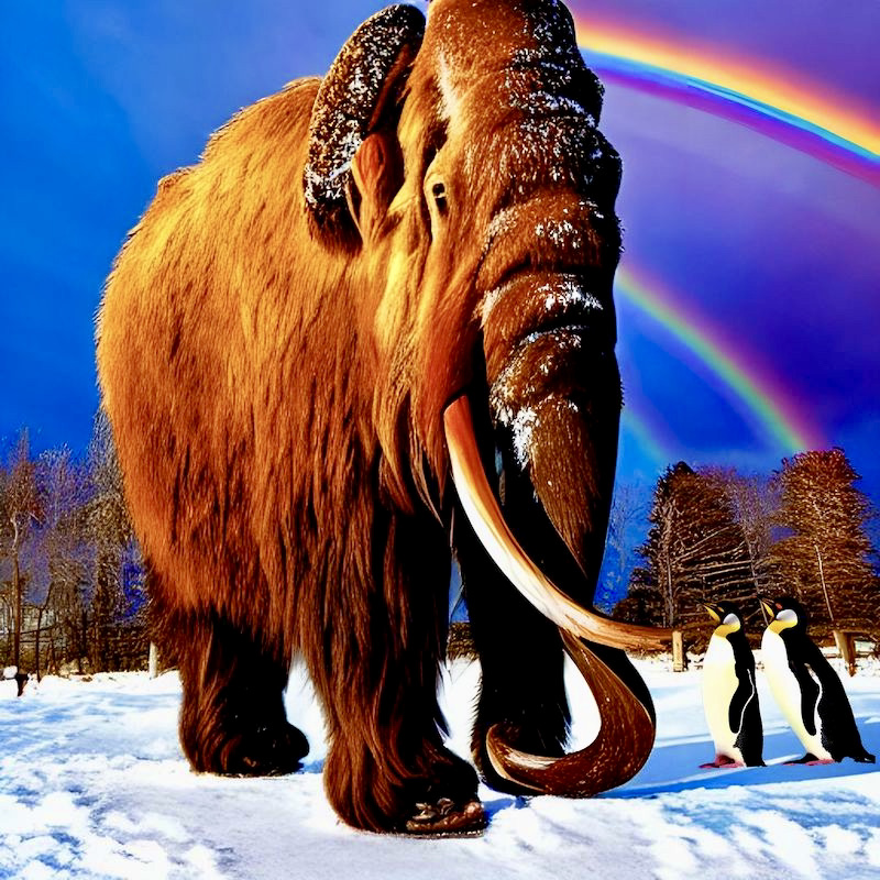 (#5) Woolly mammoth with two penguins; in a Freudian reading, my gigantic gay id is being critiqued by my chilly ego and super-ego; in another reading, two sweet twinks stand in awe of Biiig Arnold; you can probably think of other interpretations (sometimes a mammoth is just a mammoth)