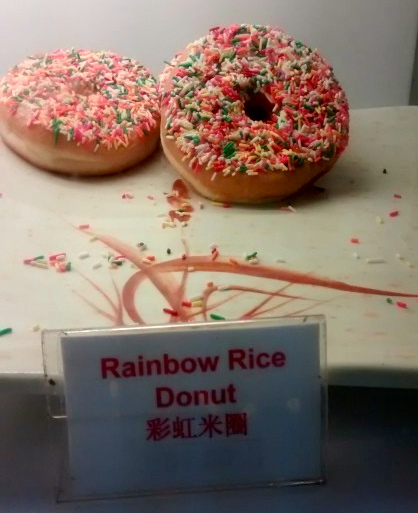 In my 12/1/14 posting “Rainbow rice”, I consider alternative names, from AmE and BrE, for various sorts of sprinkles: rice, hundreds and thousands, sugar strands, jimmies, nonpareils, dragées. Illustrated here with Singaporean donuts with rainbow rice, as these colored sprinkles are known there: