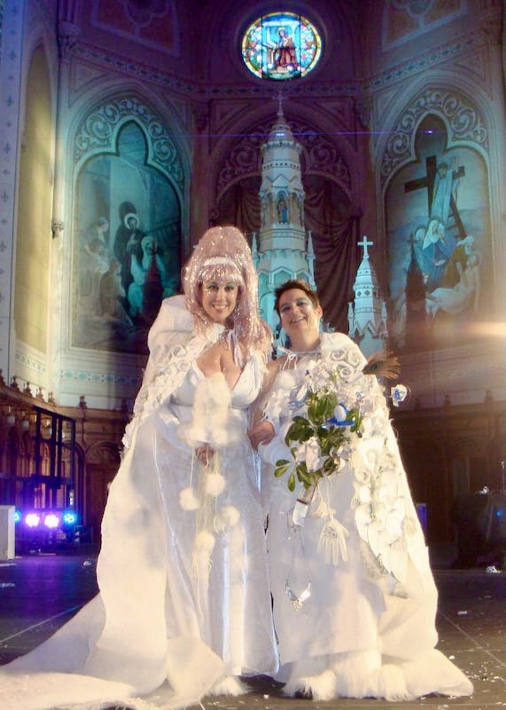 Sprinkle and Stephens together perform a variety of  “ecosexual” wedding ceremonies to nature (to the fog, to the brine shrimp, to fire, to the soil, to the coal, etc.), all of them photographed. These are playful, silly, and deeply earnest, all at once. I’m especially fond of this one, because the two women look so wonderfully happy: