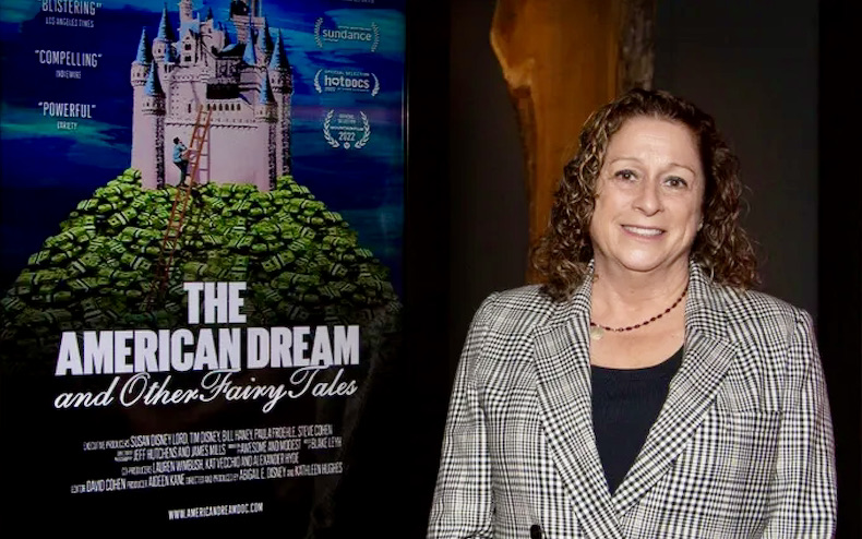(#1) Abigail Disney at Firehouse DCTV’s Cinema for Documentary Film ribbon cutting ceremony on 9/20/22 in NYC (photo: Santiago Felipe / Getty Images)MARTIN: There’s a powerful scene at the beginning of the film where you are sitting with a group of Disney employees who are organizing for better working conditions. And you ask them, how many of you have slept in your car? How many of you have had to use food stamps? How many of you have gone without medical care? And so many of the employees raise their hands, you know, multiple times. It’s disheartening. I mean, one woman talks about how she basically has made the decision not to have children because she doesn’t think she could support them.