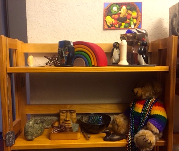 I’ve … unearthed, or brought out of dark corners, assorted bits of artwork, silly stuff, personal treasures of Jacques’s and mine, and the like — and I now have some shelves and surfaces in visible spots where they can be displayed. My cabinets of curiosities, my old curiosity shelves, my shelves of wonder: