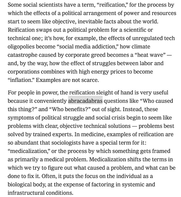 For people in power, the reification sleight of hand conveniently abracadabras questions like “who caused this thing?” and “who benefits?” out of sight