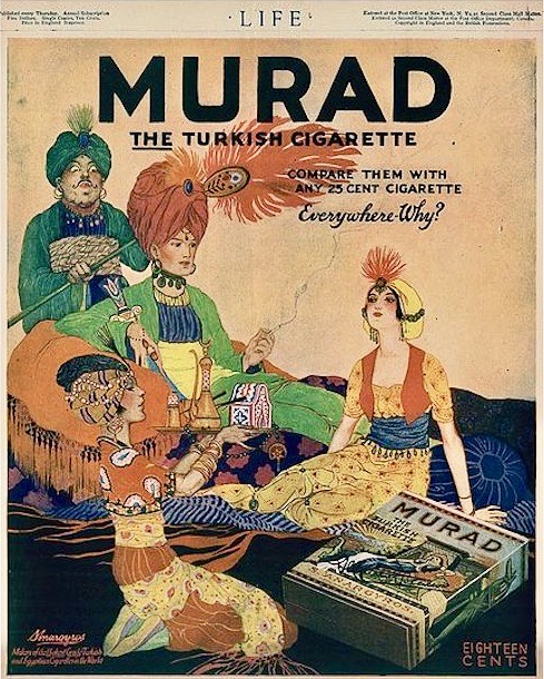 … In the early 1900s, manufactures of Turkish and Egyptian cigarettes tripled their sales and became legitimate competitors to leading brands. The New York-based Greek tobacconist Soterios Anargyros produced the hand-rolled Murad cigarettes, made of pure Turkish tobacco. [AZ: the Liggett & Myers brand Fatima was another]