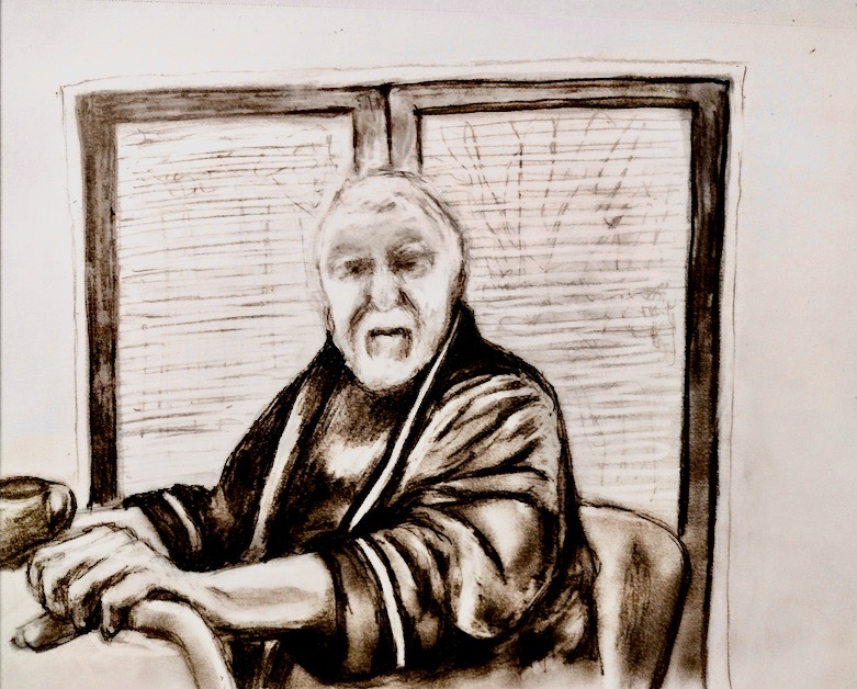 Of me. Done by Max Vasilatos after a visit to me on 1/2. To make clay forms of items of mine for bronze casts — still to come — and share holiday carrot cake and commiserate over the pains and inabilities of our poor afflicted bodies, notably the weather-induced agony of our metal hip joints. But the drawing: