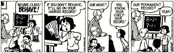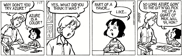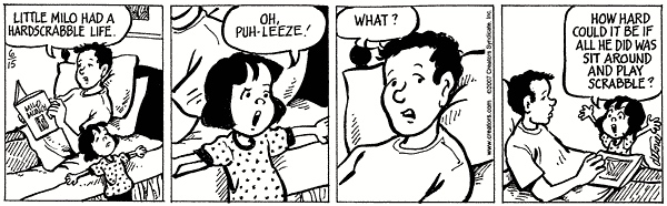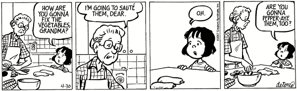 Over the past three years or so, I’ve been accumulating One Big Happy strips in this vein and am now disgorging six of them: a similarity case, in which Ruthie copes with unfamiliar material by treating it as phonologically similar familiar material (as with windchill / Winchell’s); two ambiguity cases, in which unfamiliar material is homophonous with familiar material, so she has to cope with her mistaken interpretation of what she hears; and three more complex cases (one involving portmanteaus, one involving orthographic abbreviations, and one involving Ruthie’s own analogical creation — Ruthie is indeed ingenious).