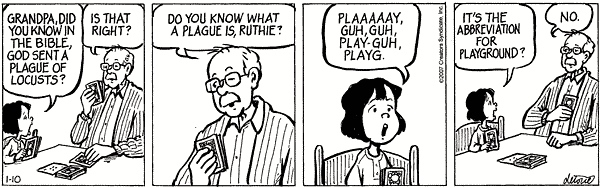 (#10) Ruthie attempts to concoct some kind of account for the unfamiliar noun plague, tries spelling it out as PLAY plus the letter G — so it looks like an abbreviation, PLAYG. in orthography, which could stand for PLAYGROUND