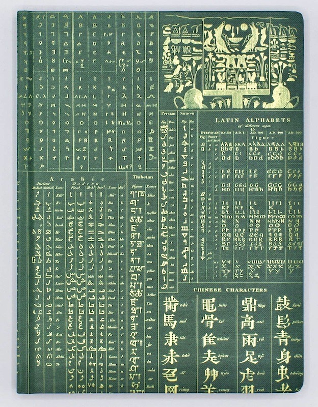 (#2) [caption:] Language encodes our history, our mythology, our science, art, and culture — let this Linguistics notebook inspire all your communication. Chinese characters, Arabic script, Egyptian hieroglyphs, as well as Hebrew, Phoenician, Greek, and many more elements of language, all rendered in pale yellow on an emerald green background.