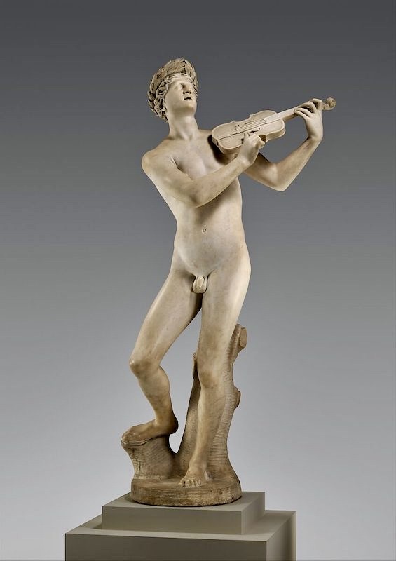 [from the Metropolitan Mueum of Art site:] Orpheus, famous for taming beasts with his music, is here shown entertaining himself, his body swaying to the sound of the lira da braccio. The statue was carved for the Palazzo Corsi, Florence.