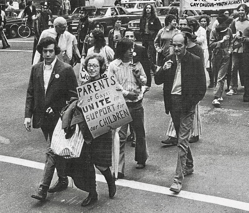 But all this hullabaloo was not, as it turned out, for the famous doctor; it was for a diminutive middle-aged woman marching just in front of him. She was not famous at all — not the author of any books, not the leader of any movement, not self-evidently a radical of any kind. With her jacket and brooch and plaid skirt and spectacles, she had the part-prim, part-warm demeanor of an old-fashioned elementary-school teacher, which she was. She was carrying a piece of orange poster board with a message hand-lettered in black marker: “parents of gays: unite in support for our children.” She had no idea that the crowd was cheering for her until total strangers started running up to thank her. They asked if they could kiss her; they asked if she would talk to their parents; they told her that they couldn’t imagine their own mothers and fathers supporting them so publicly, or supporting them at all.