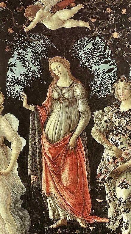 (#1) Wikipedia on the Botticelli: “In the centre .. and somewhat set back from the other figures, stands Venus, a red-draped woman in blue. … The trees behind her form a broken arch to draw the eye. In the air above her, a blindfolded Cupid aims his bow to the left”