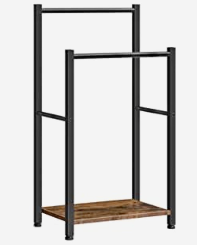A bewildering array of options presented themselves, but in fact Amazon’s recommended choice was just right for my purposes: the HOOBRO freestanding towel rack, a 2-tier holder for the bathroom, 16.5″ x 9.4″ x 31.5″, with shelf, in black: