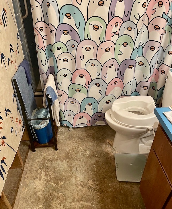 That’s state 1. State 2 came about when I was in the rehab center recovering from alcohol poisoning. On the recommendation of occupational therapists, the glass doors were removed and carted away, as unsafe. They were replaced by a pole firmly anchored in the walls, from which a shower curtain — a delightful penguin print, as you will see in a photo below — now depended. All that remained for towels and wash cloths was one of the hooks on the back of the door, the other being needed for my bathrobe.