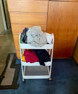 — in my bedroom, a rolling utility cart serving as two laundry baskets (one for hot-water wash, one for cold-water wash; I do all the laundry myself)