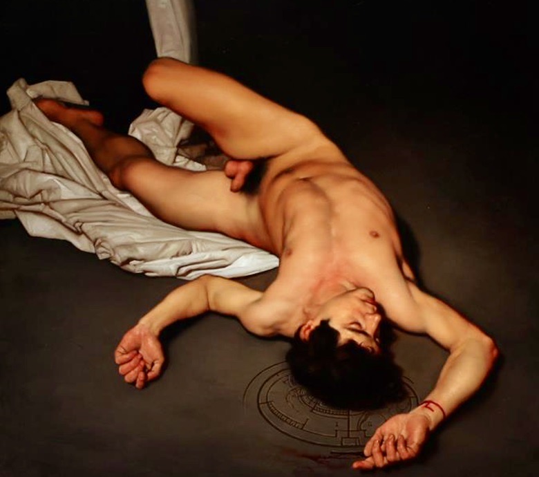 Sources seem not to comment on the homoerotic edge to his images, but it’s sometimes quite powerful, as in the 2016 nude Il Martire (The Martyr):