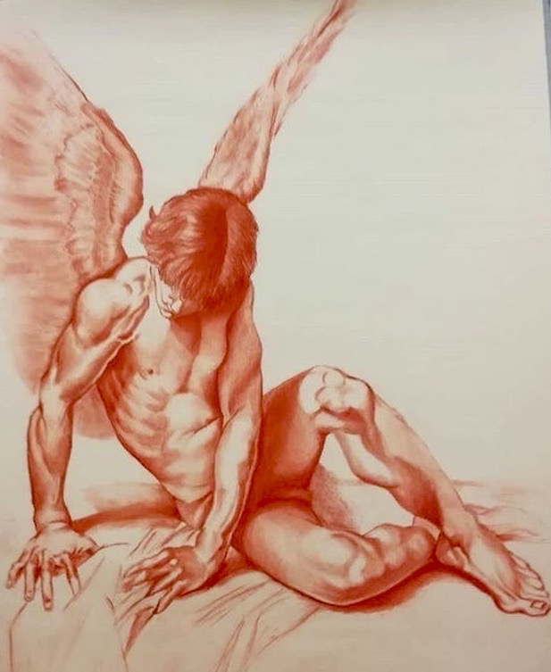 (#2) This turns out to be a hematite-red monochrome drawing (artist not identified) based on the 2011 painting Fallen Angel by Italian artist Roberto Ferri, which WikiArt describes as “neo-baroque” and “kitsch” in the religious painting genre (more on Ferri below)