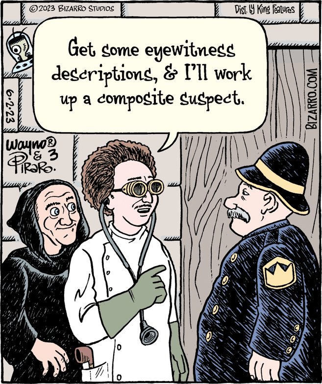 (#1) The doctor offers a made-to-order suspect to fit the eyewitness descriptions (If you’re puzzled by the odd symbols in the cartoon — Dan Piraro says there are 3 in this strip — see this Page)