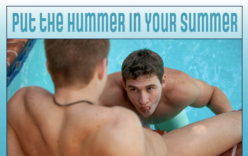 A summer hummer: the cute and muscular cocksucker has locked his gaze with that of the guy he’s servicing, giving attention to the man he’s blowing, not just his dick (all this in a swimming pool, with the fellatee sitting on the pool’s edge and the fellator standing on the pool’s bottom, giving the cocksucker pretty much for perfect angle for the blow job — satisfaction all around); you’ll also have to imagine the humming that provides extra sensation for the fellatee