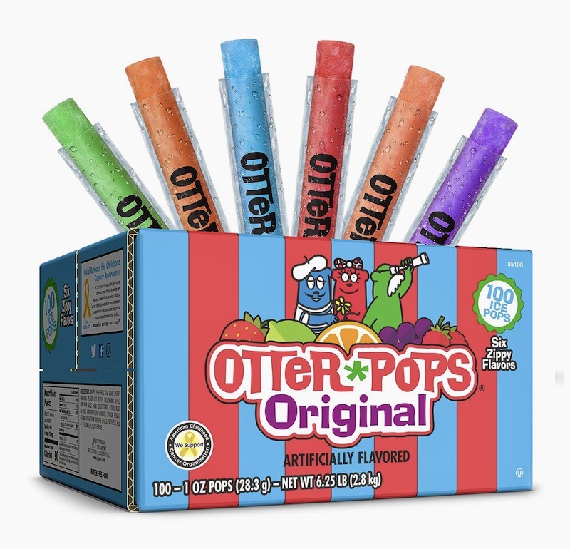 In 1996, Jel Sert acquired the rights to Otter Pops as well. During the 2000s, Jel Sert modified the Otter Pops recipe to add more fruit juice. The company’s manufacturing facilities are in West Chicago, Illinois. Otter Pops come in 1-, 1.5-, 2- and 5.5-ounce serving sizes. They also come in 6 flavors, each [playfully] named after a different character [AZ: the article goes on to list 12 named flavors, only two of which have been discontinued]: