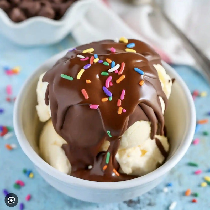 Photos of bottles of the syrups are not of much interest; you want to see the stuff in action. For that, we can turn to the Live Well Bake Often site, “Homemade magic shell” by Danielle on 6/7/16 — with a description of the 2-ingredient recipe and a photo of the result: