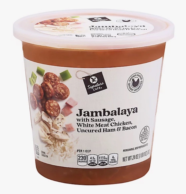Signature Cafe spicy jambalaya with sausage, white meat chicken, uncured ham & bacon ($7.99 for a 24 oz container)