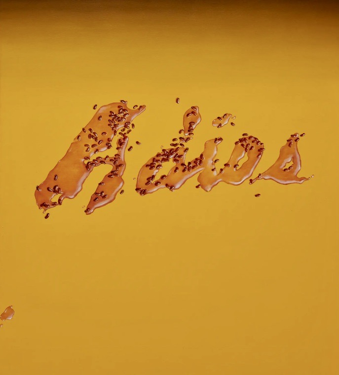(#2) From “Ed Ruscha/Now Then” at MoMA, his painting “Adios” (1967) isolates five letters in paint that appears like maple syrup. Beans seem to stick to the vowels and consonants.