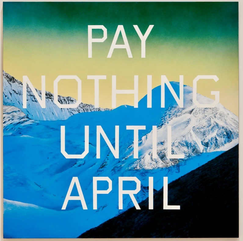 (#7) “Pay Nothing Until April,” a painting from 2003. Ruscha’s later text paintings employ a typeface of his own design, which he called Boy Scout Utility Modern.