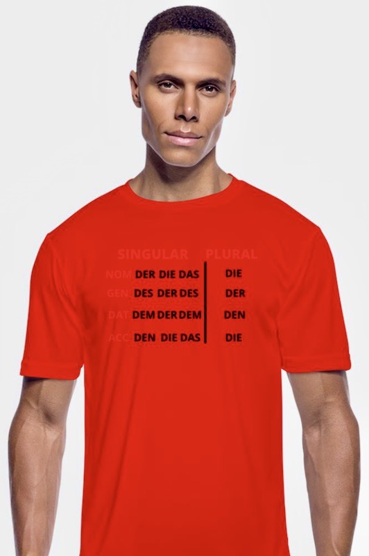 (#2) From the Spreadshirt company, a men’s sport t-shirt, designed by Samin Bin Humayun, in red, showing the forms of the definite article in German