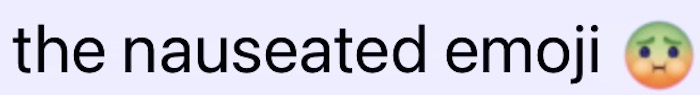 — AZ > TE: Apparently a greener variant of the vomiting (face) emoji, in which the face is all yellow. I can’t reproduce the yellow variant here, because FB automatically gives this variant, while Microsoft Word automatically gives the yellow variant 🤮 (so I can’t reproduce your emoji in a Word file). Bizarre. I like your variant better. It’s a combo of the yellow-faced vomiting emoji and the nauseated emoji 🤢 (which is all green-faced in Word; more bizarreness). On FB: