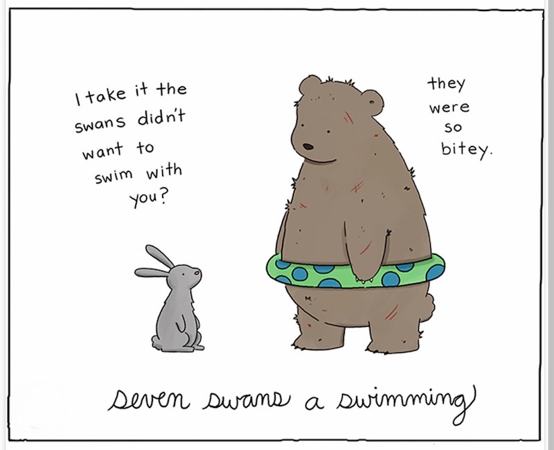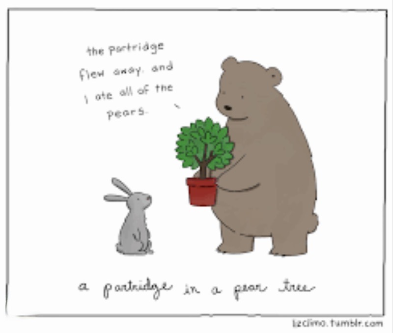 Is the partridge in #1, perhaps, a New Zealand flightless partridge that has managed to perch precariously in the pear tree? Some sort of aukridge? (I have inquired of the artist, but they haven’t risen to the bait.)