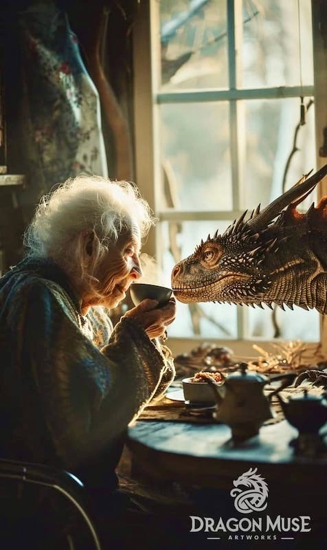 One more for today. A favorite from a series I’m working on. I love putting dragons in weird places.  This one, while it may be uncommon… doesn’t feel so weird.  Would be nice if all our elderly had a watch-dragon to share tea with.  I’ve created a whole series of these. 🙂 I love them.